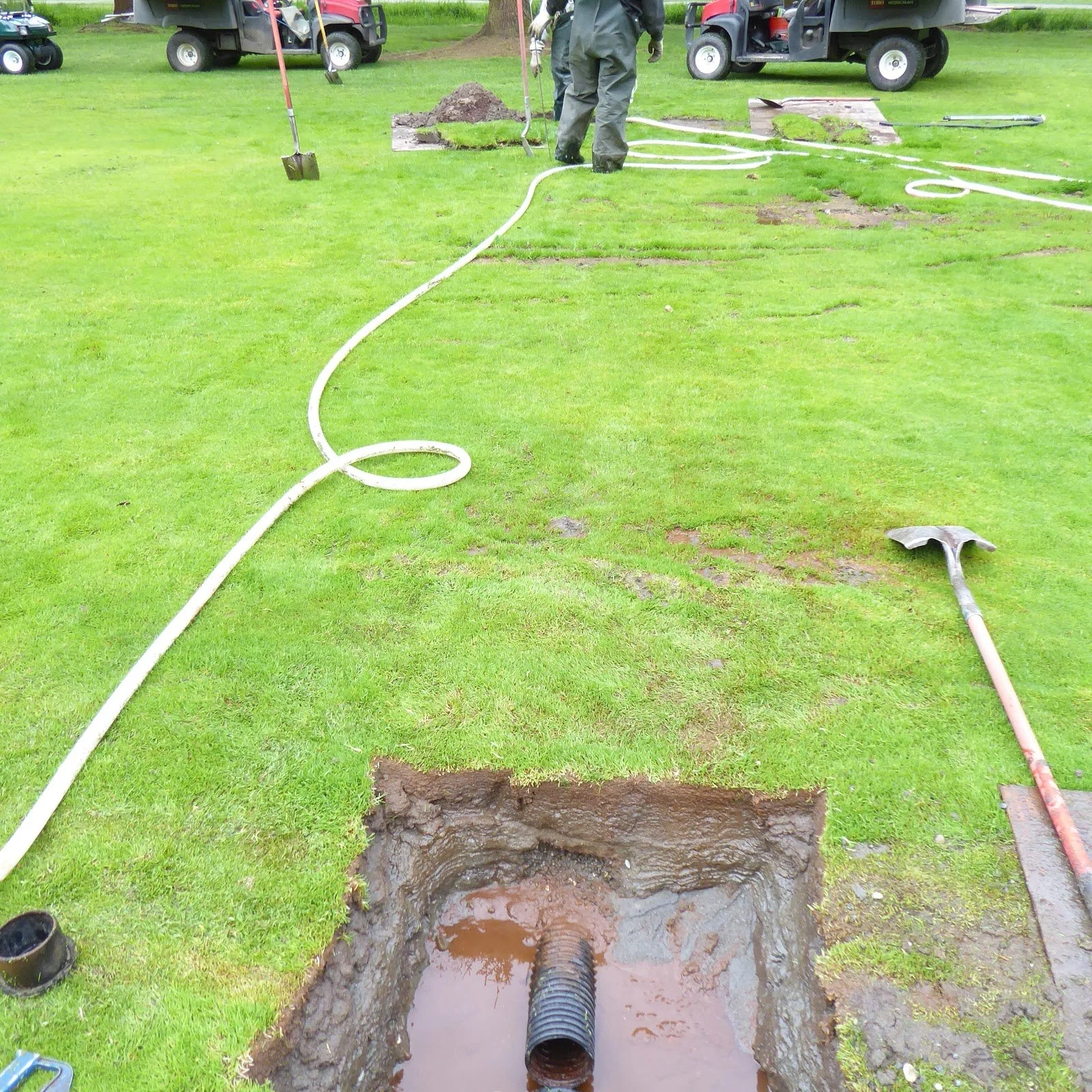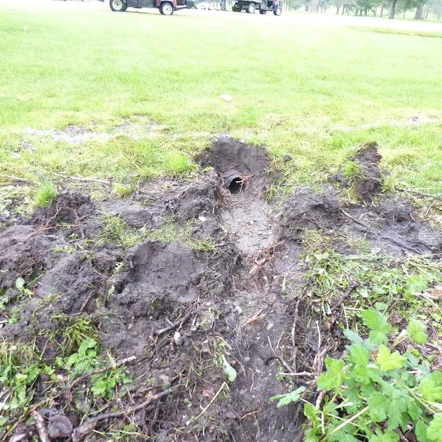 Long trench for drain line next to the 9th green. Completely fixed the wet 9th apporach