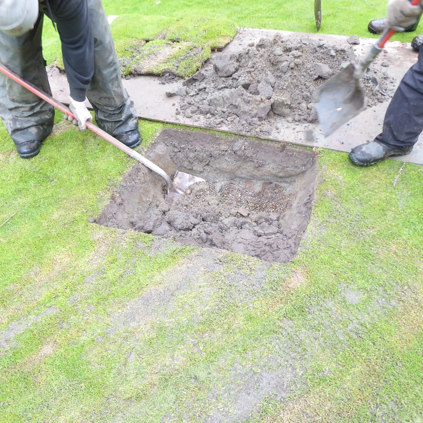 Fixing a collar dam on the 13th hole, allowing water to drain off the front of the green